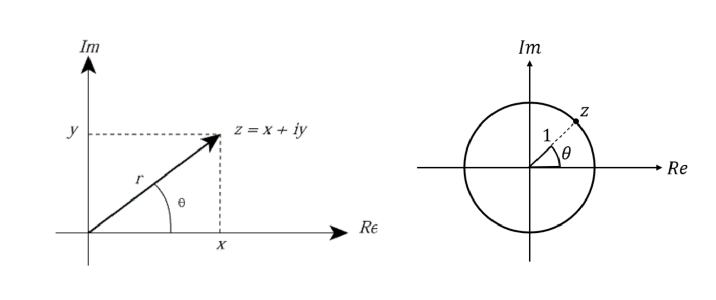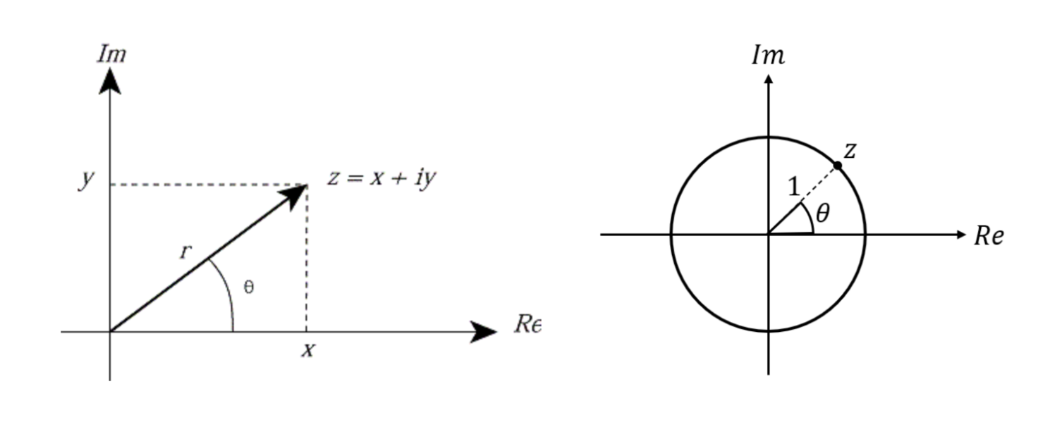 ❗️이때 위 복소평면에서 복소수 z(=x+iy)는 거리(r)와 각도(θ)를 통해 좌표를 나타내는 극좌표계로서 z=rcosθ(실수부)+r(isinθ)(허수부) 로 표현할 수 있으며 특히 r=1인 단위 원에서는 z=cosθ+isinθ로 표현됩니다.
