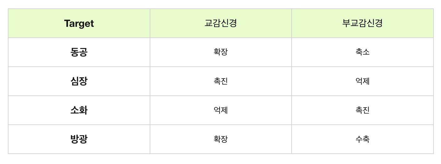 생명과학 3단원 '항상성과 몸의조절' 단원에서 배우는 것 처럼, 심장박동, 호흡 등의 생명 유지에 필수적인 과정은 교감신경과 부교감신경으로 이루어진 자율신경계에 의해 엄격하게 조절된다. 이름에서 느껴지는 것 처럼 아래표와 같은 자율신경의 조절은 우리가 의식하지 못함에도 자율적으로 일어나고 있다.