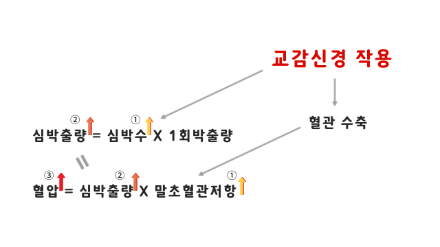 다음으로, 교감신경이 작용하면 혈관이 수축하는데, 혈압은 심박출량과 말초혈관의 저항의 곱으로 정의되기에, 앞선 심박수 증가로 인한 심박출량의 증가에 더불어 혈관 수축에 의한 말초혈관 저항의 증가에 따라 결과적으로 혈압은 증가하게 된다.