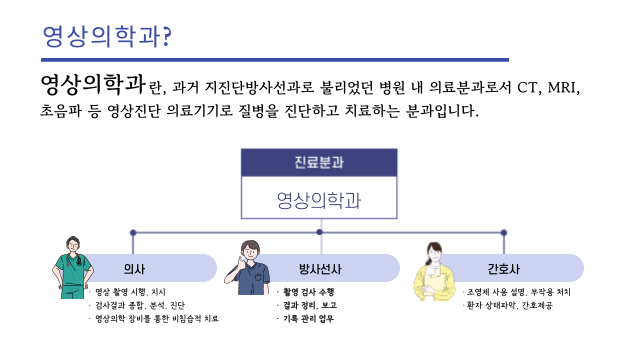 ❗️영상의학과의 구성 역시 다른 분과와는 차이점이 있는데, 영상의학과는 영상 촬영을 직접 시행하거나 혹은 지시하며 검사결과를 종합, 분석, 진단하고 비침습적 치료를 수행하는 의사 선생님과, 의사의 지시에 따라 촬영 검사를 수행하고 결과를 정리해 보고하며 기록을 관리하는 방사선사 선생님, 영상 촬영에 필요한 조영제를 투여하기 전 환자에게 설명하고 부작용 발생시 이에 대응하며 또한 필요한 간호를 제공하는 간호사 선생님으로 구성됩니다.