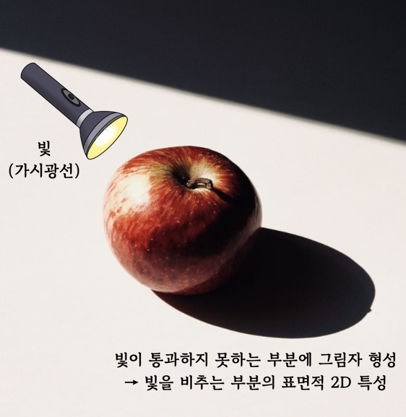 ✔️ 어두운 환경에서, 어떤 사과에 빛을 비추면 빛이 사과를 통과하지 못해 생기는 그림자가 만들어질 것입니다. 우리가 비추는 빛은 가시광선으로서 사과와 같은 일반적인 물체를 통과하지 못하기에 빛을 비추는 방향의 반대 영역에 빛이 통과하지 못함으로써 어두운 그림자가 형성됩니다. 즉, 그림자를 통해 우리는 빛을 비추는 한 방향에서의 사과의 크기, 표면 등 2차원적인 외적 특성을 파악할 수 있습니다. 만약 빛을 모든 방향에서 비추고 그림자를 확인한다면, 사과의 모든 방면에서의 외적 특성이 파악될 것이고, 그로부터 우리는 사과의 모습을 종합적으로 추론하여 3차원적인 입체의 외형을 떠올릴 수 있을 것입니다.