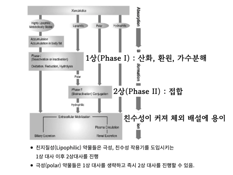 ✔️ 간에서의 약물 대사는 인체가 외부에서 유입된 약물을 유해한 물질로 인식하여 이를 해독하고 배설하기 쉬운 형태로 전환하는 과정이라 할 수 있습니다. 통합과학 교과에서 배운 것처럼, 친지질성의 물질들은 세포막을 잘 투과할 수 있으므로 유해한 물질로 인식된 약물 등을 간에서는 대사를 통해 친수성 혹은 극성의 물질로 전환시켜 우리 몸의 여러 세포들에 퍼져나가지 않도록 하며 또한 제거하기 쉬운 형태로 전환해야합니다.