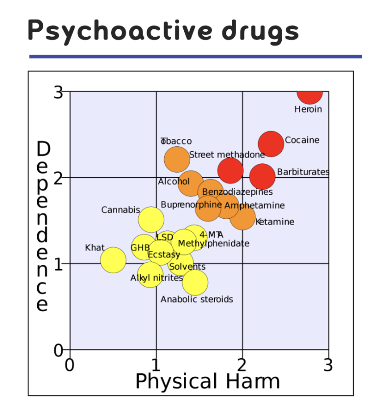 ❗️또한 국내 법적으로 향정신성의약품을 분류하는 것과 마찬가지로 Psychoactive drug는 Physical harm(물리적 위해성), 그리고 Dependence(의존성) 정도에 따라 위와 같이 분류될 수 있으며, 이는 마찬가지로 의료적 사용 여부를 결정하는 기준이 될 수 있습니다.