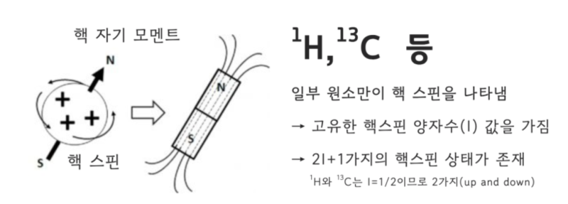 ✔️ 지난 탐구에서 살펴본 것 처럼, 홀수개의 양성자 혹은 중성자를 가지는 1H 혹은 13C와 같은 원자핵들은 스스로 회전하는 '스핀' 현상을 나타내며 이러한 양성자의 운동(전하의 운동)에 의해 원자핵은 작은 자석과 같은 특성을 가지게 됩니다(원형 도선에 전류가 흐를 때 자기장이 형성되는 것과 유사한 원리).