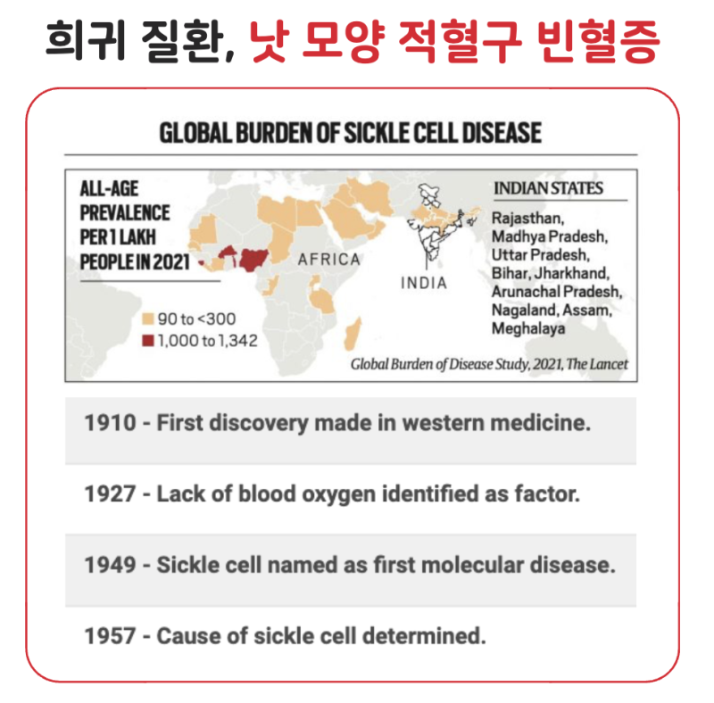 낫모양 적혈구 빈혈증은 1957년 그 원인이 밝혀졌지만, 여전히 그 본질적 원인(유전자 이상)을 해결하는 마땅한 치료제가 없는 희귀 질환에 해당하며 주로 선진국이 아닌 아프리카에서 발병한다는 것 또한 unmet needs가 존재하는 하나의 이유가 됩니다.