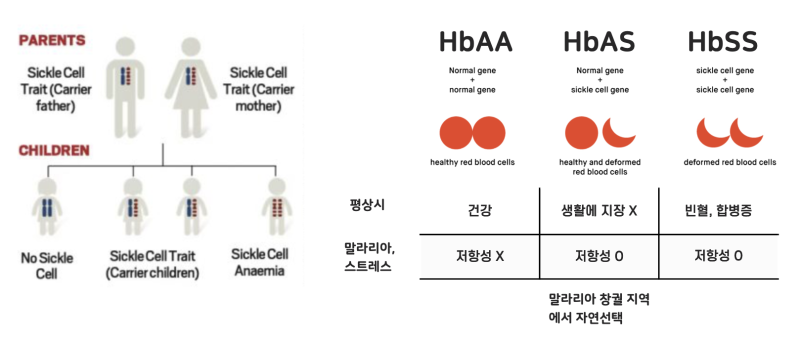 낫모양으로 변한 적혈구에서는 말라리아가 증식하지 못하므로 말라리아 저항성을 가지게 되며 이러한 이점으로 인해 해당 형질이 말라리아가 창궐하는 지역에서는 자연선택 되는데, 이는 결국 낫 모양 헤모글로빈 유전자 S가 사라지지 않고 존재하게 합니다. 평상시에 생활에 지장이 없으며 말라리아에 저항성을 가지는 HbAS 형질의 두 부모 사이에서 유전에 의해 낫 모양 적혈구 빈혈증의 자식이 태어날 수 있는데, 이러한 자연선택과 유전의 원리가 아프리카 특정 지역에서 낫 모양 적혈구 빈혈증(HbSS)이 주로 발생하는 이유가 됩니다.