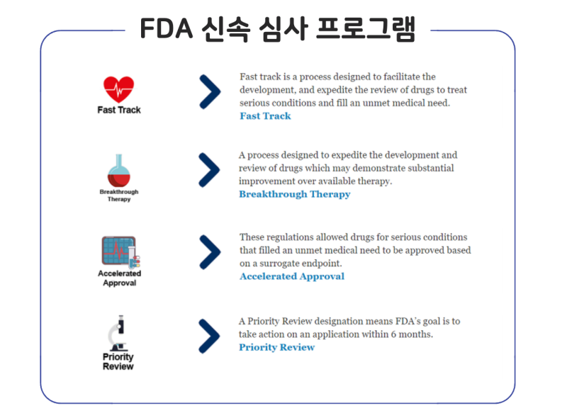 ❗️ 또한 FDA는 심각한 질환(Serious disease) 혹은 희귀 질환(rare disease) 치료제의 연구개발이 신속하게 진행될 수 있도록 하는 '신속 심사 프로그램(FDA's Expedited Drug Approval Programs)을 운영하고 있습니다. 해당 프로그램은 ① Fast track, ② Breakthrough Theray, ③ Accelerated Approval, ④ Priority Review 네가지 제도로 운영됩니다.