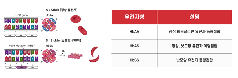 ⇢ 헤모글로빈의 유형을 유전자형으로 나타낼 수 있습니다 이때 A는 정상 성인 헤모글로빈 유전자를 의미하며, S는 낫모양 유전자를 가지는 것을 의미합니다. 따라서 HbAA라 함은 정상 성인 헤모글로빈 유전자를 동형접합으로 가진 헤모글로빈 유형을 의미하며, HbAS는 정상과 낫모양의 이형접합, HbSS는 낫모양 유전자의 동형접합인 헤모글로빈 유형을 의미합니다.