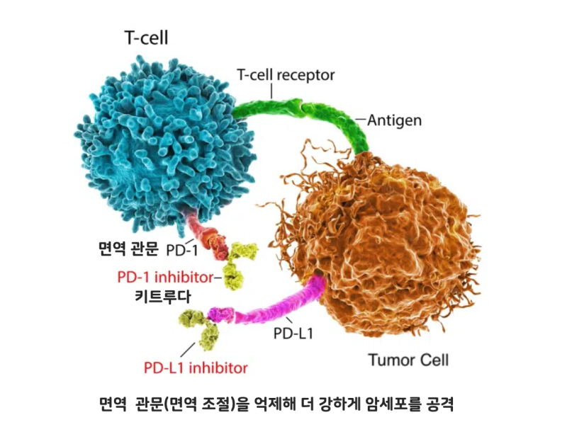펨브롤리주맙은, T세포 존재하는 PD-1을 억제하는데, PD-1 면역관문(면역을 조절하는 역할)으로서, 주로 암세포 표면에 존재하는 PD-L1(암세포의 면역 회피 기전으로 암세포 표면에 과발현 되어있음)과 결합하게 되면 T세포의 면역반응을 억제하게 됩니다. 펨브롤리주맙에 의해 PD-1과 PD-L1의 결합이 억제되면, 면역 반응 조절이 억제되어 (억제를 억제하는), T세포가 더욱 활성화됨으로써 암세포를 효율적으로 공격하게 됩니다.