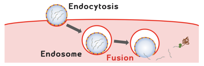 이러한 융합에 의해 핵산을 감싸고 있던 외부 지질층이 벗겨지고(Uncoating), 바이러스 구조 내부에 존재하던 바이러스 RNA (viral RNA)가 세포막으로 방출되며, 방출된 바이러스 RNA는 숙주세포의 핵으로 이동하게 됩니다.