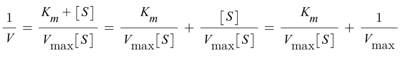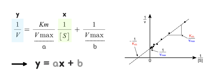 Km과 Vmax는 상수에 해당한다는 것을 앞서 살펴보았습니다. 이때 1/V를 y로, 1/[S]를 x로 두면 위 방정식은 y=ax+b의 직선의 방정식으로 정의할 수 있습니다.