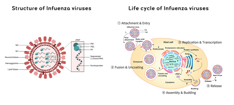 ❗️이번 탐구에서 우리는 바이러스 중에서도 독감을 일으키는 인플루엔자 바이러스 A, B의 생활사에 대해 몇가지 중점적 단계들로서 살펴보도록 하겠습니다.