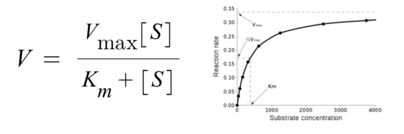 ※ MM식에서 V는 효소에 의해 기질(반응물)로부터 생성물이 만들어지는 초기 반응속도를 의미하며 Km은 효소와 기질의 친화도를 나타내는 상수(해리상수)이며, Vmax는 효소에 의한 최대 반응속도를 의미하는 상수입니다. MM식 그래프는 반응속도 V를 y로, 기질의 농도 [S]를 x로 하여 나타낸 그래프입니다.