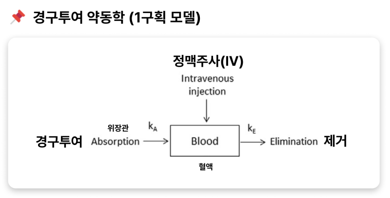 ❗️ 경구투여시 흡수(Absorption)란 복용한 약물이 소장을 거쳐 혈액 중으로 이행되어 혈중 약물 농도 Cp(Plasma concentration)가 증가하는 것을 의미하며, 제거(Elimination)란 간의 대사과정 혹은 콩팥의 배설 과정을 통해 혈중 약물의 농도가 감소하는 것을 의미합니다.