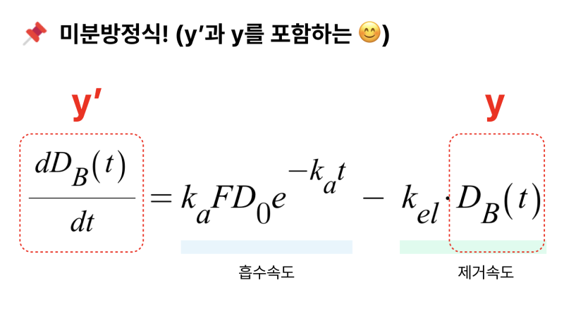 → 위의 흡수속도를 대입하여 다시 정리하면 경구투여 이후 시간에 따른 혈중 약물농도의 변화는 위와 같이 정리됩니다. 이때 DB(t)를 y, DB(t)/dt를 y'(도함수)라 할 수 있으며, 즉 위 방정식은 y'과 y를 모두 포함하는 미분방정식의 형태라 할 수 있습니다.
