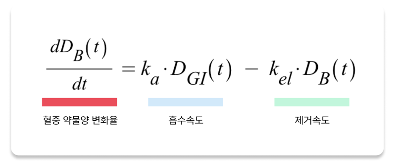 = 흡수에 의한 양의 증가(흡수속도) - 제거에 의한 양의 감소(제거속도) 로 나타낼 수 있습니다.