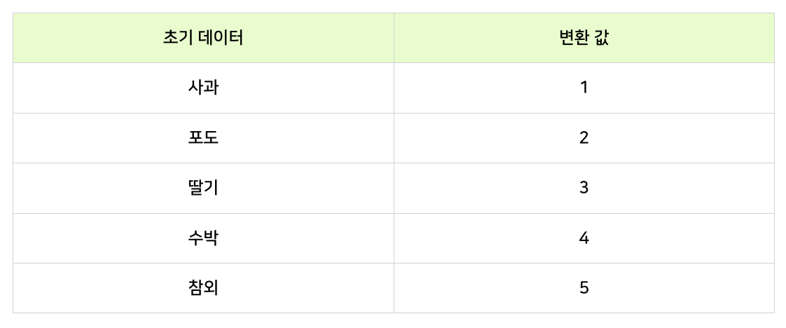 포도 수박 참외 사과 딸기는 ⇢ 2 4 5 1 3 으로 인코딩(변환)되며, 컴퓨터는 이렇게 숫자로 변환된 데이터를 이해하고 처리할 수 있습니다.