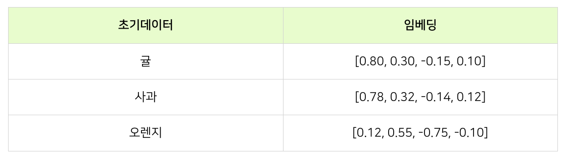 ❗️위와 같이 차원을 축소하여 dense(밀집)하게 데이터를 변환하는 장점 외에도 임베딩 방식은 변환된 벡터가 초기 데이터 사이의 유사성과 관계를 반영한다는 차이가 있습니다. 즉, 유사한 데이터는 임베딩 결과 벡터 공간에서 서로 가깝게 위치하게 됩니다. ⇢ 위 예시에서 귤과 오렌지는 큰 유사성을 가지는 과일이라 할 수 있으며 따라서 임베딩 결과 귤과 오렌지를 변환한 벡터는 서로 유사하게(벡터 공간에서 가깝게) 나타나게 됩니다.