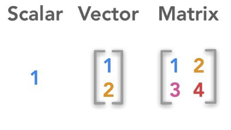 ⌙ 스칼라와 벡터의 비교는 통합과학과 물리 과목에서 아마 들어본 적이 있으실 것으로 생각됩니다. ✓ 스칼라는 단순히 하나의 값으로 방향을 가지지 않고 크기만을 가지는 물리량 입니다. 반면 크기와 방향을 가지는 물리량으로 배웠던 ✓ 벡터는 여러 차원으로 표현되며 스칼라보다 더 많은 데이터, 정보를 나타낼 수 있습니다. 고등수학 기하과목에서 배우는 벡터는 주로 2차원, 3차원 공간에서 표현되지만, 그보다 차원을 더욱 늘려서 더 많은 정보를 포함할 수 있습니다. 예를 들어 (a,b,c,d,e)는 5차원의 벡터입니다.