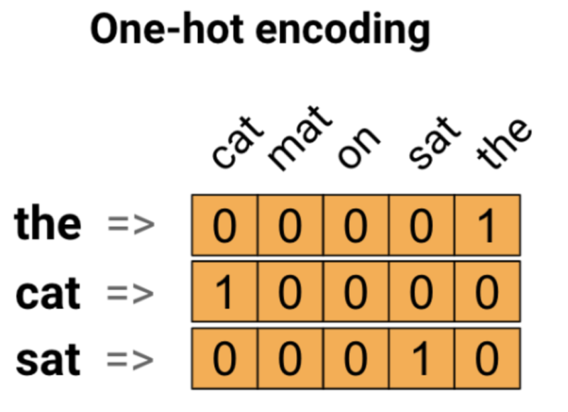 위 그림과 같이 the, cat, sat 이라는 세가지 단어의 데이터가 있을 때, 각각의 데이터는 그와 일치하는 위치에만 1의 값을 가지고, 나머지 위치는 0으로 채워지는 벡터로서 변환되는 것입니다. 많은 데이터를 원-핫 인코딩으로 변환하게 되면 차원이 커짐에 따라 위 그림과 같이 의미없는 수인 0이 굉장히 많이 등장하게 되는데 이러한 특성을 'sparse(희소)'하다고 표현합니다.