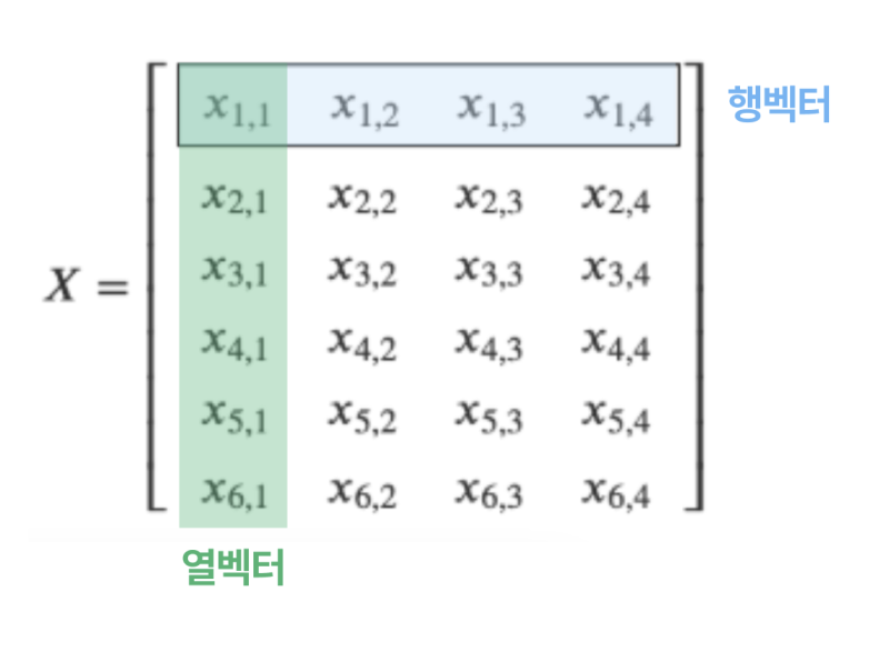 ⌙ 행렬은 가로 줄인 행(row)과 세로 줄인 열(column)로 구성되며 m개의 행과 n개의 열을 가진 행렬을 m x n 행렬이라 합니다. 위 그림의 박스와 같이 행이 1개 또는 열이 1개인 행렬은 벡터가 되며, 행이 1개인 벡터를 행 벡터, 열이 1개인 벡터를 열 벡터라고도 합니다.
