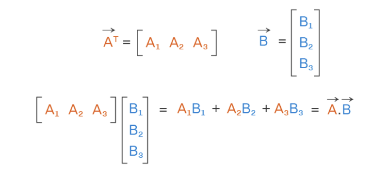 ⌙ 위 방법과 다른, 벡터의 내적의 또 다른 방법으로는 하나의 벡터를 행벡터로, 다른 벡터를 열벡터로 놓고 각각 가로, 세로의 순서대로 하나의 성분씩 곱해 더하는 방식이 있습니다. 실제 계산을 해보면 위 방식과 동일한 결과값이 나오게 됨을 확인하실 수 있습니다.