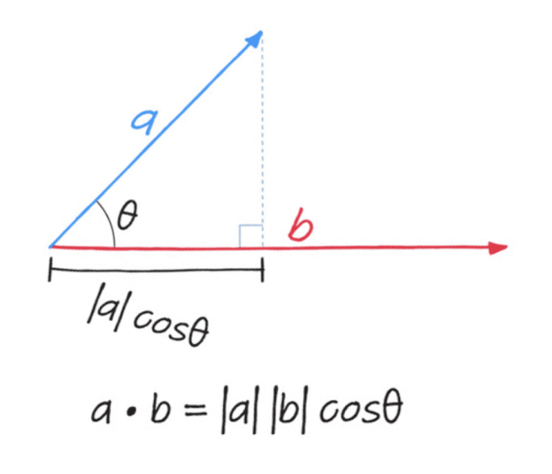 ⌙ 기하 과목에서는 두 벡터의 내적이 두 벡터의 크기의 곱에 두 벡터 사이 각도의 코사인 값을 곱한 것으로 배웠습니다.