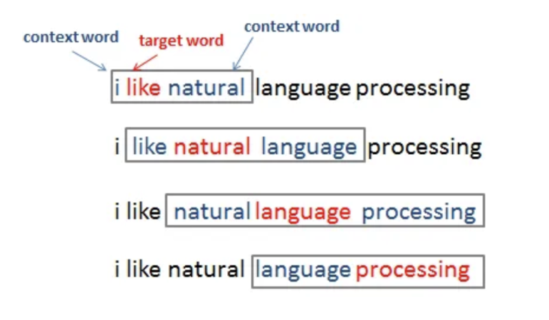 ⌙ Word2Vec은 임베딩 과정에서 수많은 문장들을 학습하는데요, 우선 하나의 문장을 놓고 어떻게 학습이 이루어지는지 살펴보겠습니다. Word2Vec의 기본 콘셉은 문장에서 중심 단어(타겟 단어)와 주변 단어(문맥) 사이의 관계를 학습하는 것인데요, 이러한 학습은 하나의 단어를 보고 다른 단어를 예측해내는 방식으로 이루어지며 이를 predictive method 방식이라 합니다.