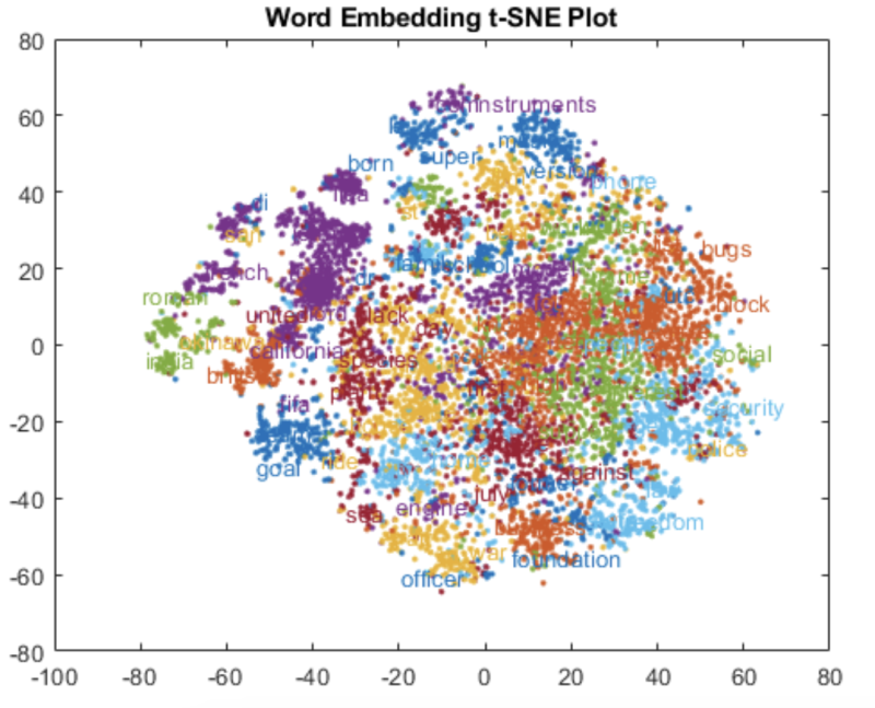 그러한 고차원 벡터를 벡터들 사이의 거리와 구조를 유지한채 2D 공간에 시각적으로 표현해주는 방법인 t-SNE plot (그 원리에 대해서는 분량의 한계로 이번 탐구에서는 생략하도록 하겠습니다.)에서는 위 그림과 같이 유사한 의미의 단어 벡터들이 군집을 이루며 가까이 위치한 것을 확인할 수 있습니다.