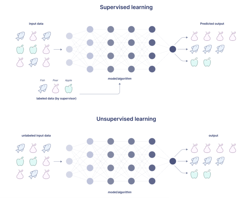 ⌙ 지도학습 (Supervised learning)은 위 그림과 같이, "자 이게 물고기고, 이게 배고, 이게 사과야" 즉 정답을 미리 알려준 후 학습하도록 하고 "초록색이고 잎이 달린건 무엇이게?" 에 대한 정답을 예측하도록 하는 방식인 반면,