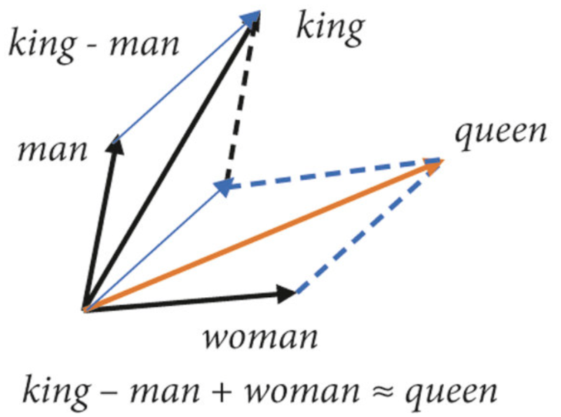 ⌙ 또 다른 예시로, 위 그림과 같이 king, man, woman, queen 단어들 사이의 수식을 들 수 있습니다. king에서 man을 빼고 woman을 더하는 의미적 계산을 통하여 queen이 도출되는 것을 이해하실 수 있습니다.